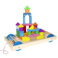 教育目的:激发宝宝自己动手兴趣;培养宝宝你整理组合搭配的意识,锻炼宝宝手眼配合的能力;让宝宝对几何图形有一定的认识,由此引出数学概念。19块形状各异,不同色彩的积木,可搭建不同造型的建筑物,木盒的两边独特的设计了两个装有叮当,可以滚动的小筒,可以让宝宝自由的拖着积木到处游玩。拿掉积木,宝宝还可以在木盒上装载自己心爱的玩具公仔。几何形状各异,不同色彩的小块积木,装在一个类似于货车的车厢里,可搭建不同造型的建筑物,让孩子们自由的拖动。